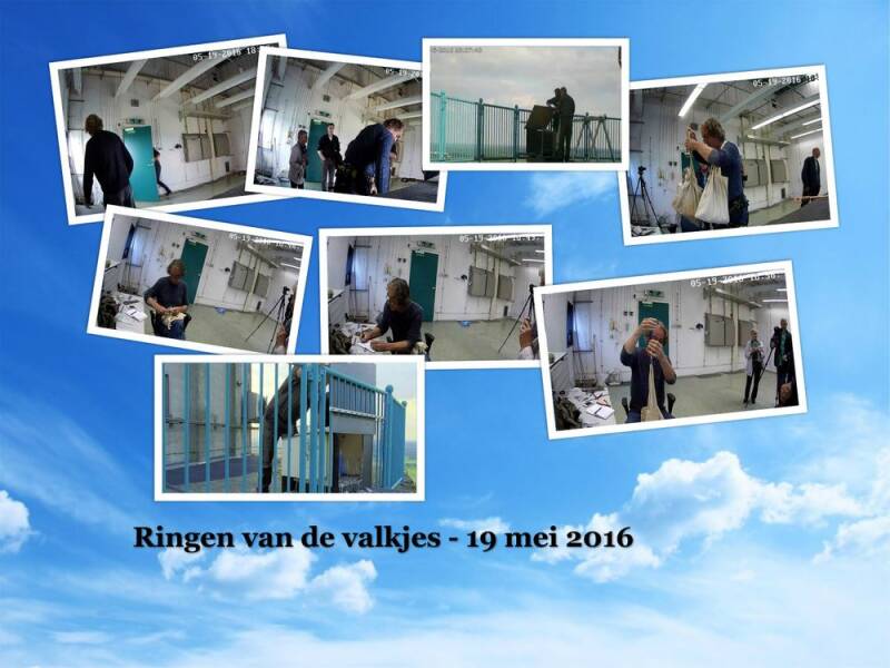 19 mei 2016 - De valkjes worden gewogen,terwijl ze in de tas zitten en ze worden ook gemeten.Aan de hand van de bevindingen wordt het geslacht bepaalt : Het zijn drie meisjes en een jongetje.Ook is de nestkast weer schoongemaakt.